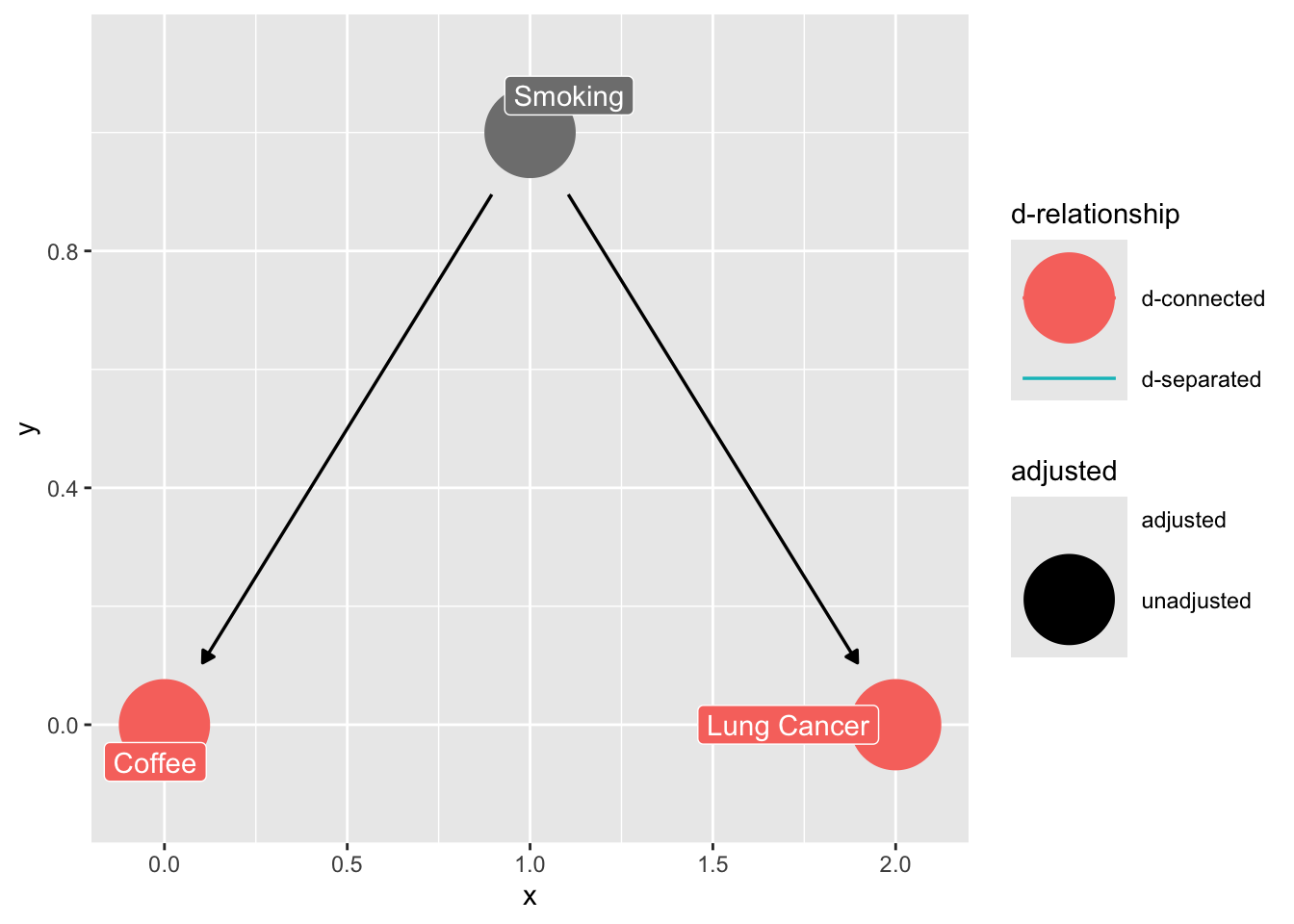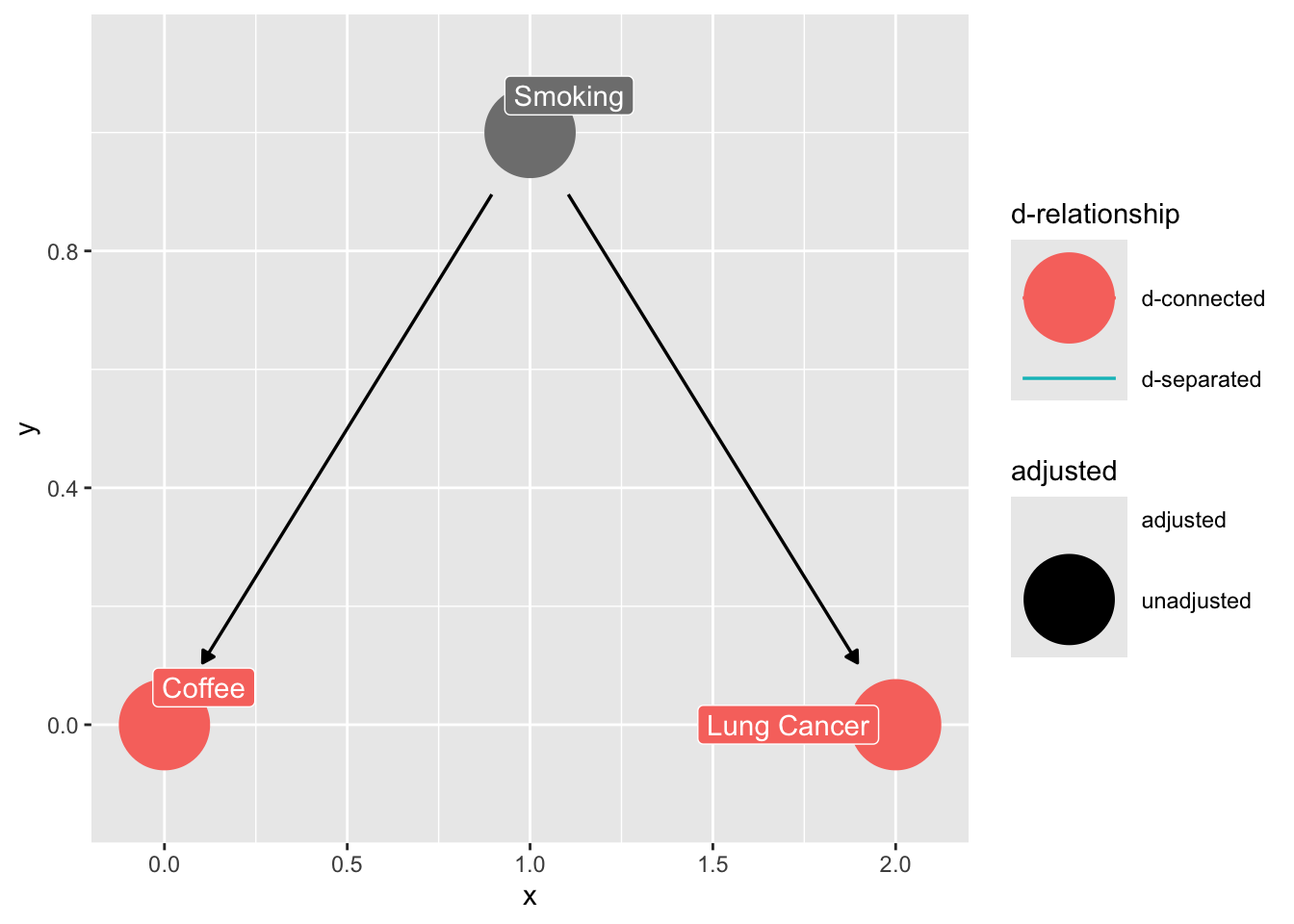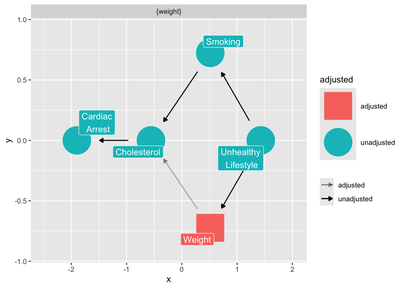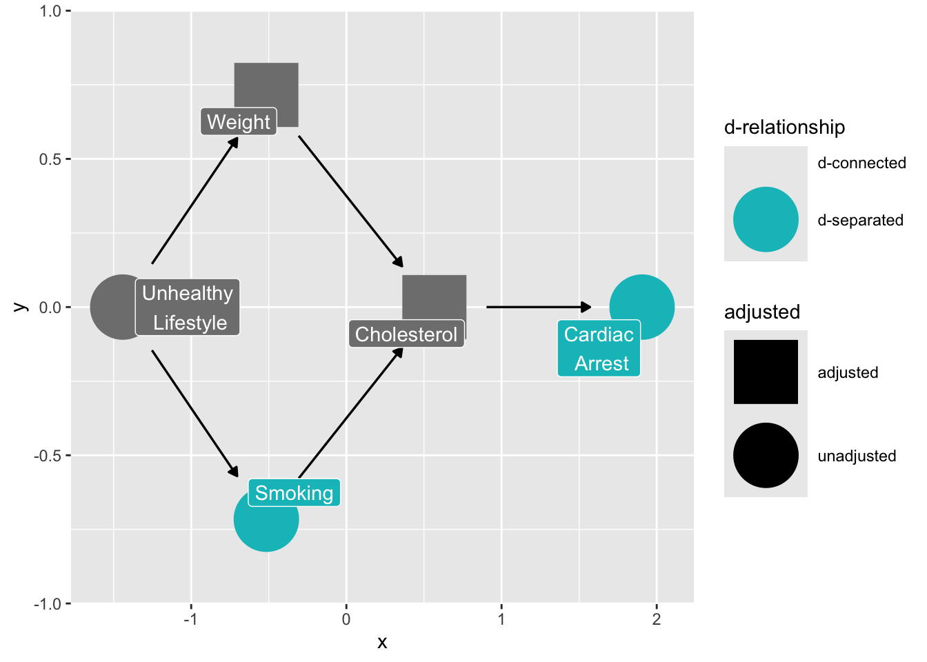 - The `ggdag` package can help you to obtain causal inference, but it relies on assumptions that are not part of your data.