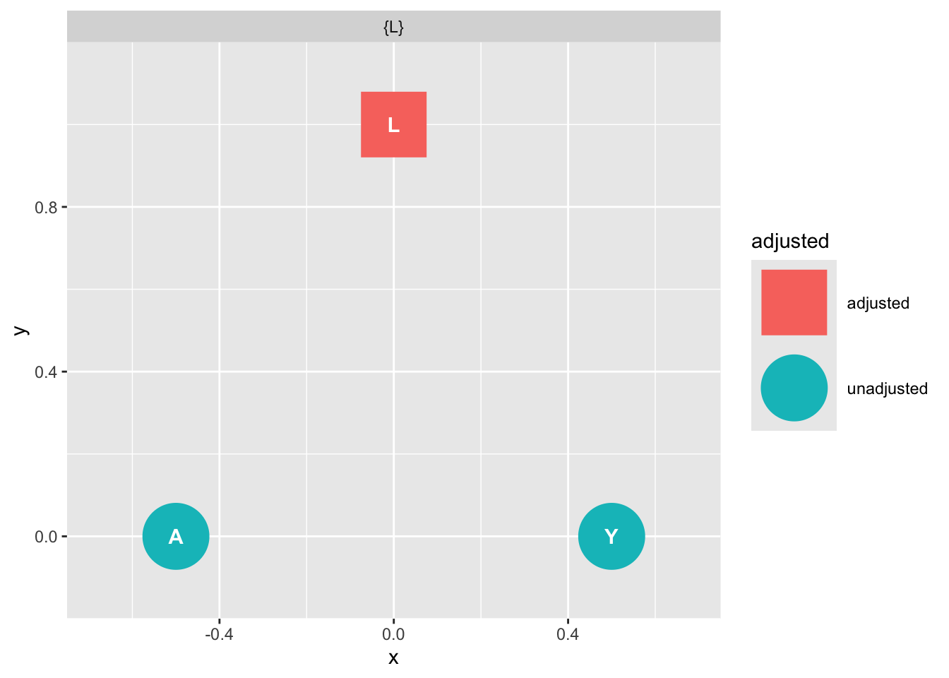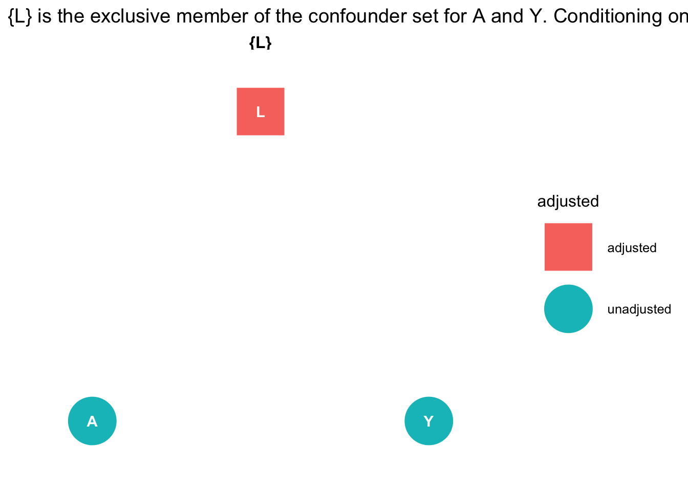ggdag::ggdag_adjustment_set( graph_fork ) + theme_dag_blank() + labs(title = "{L} is the exclusive member of the confounder set for A and Y. Conditioning on L 'd-separates' A and Y ")