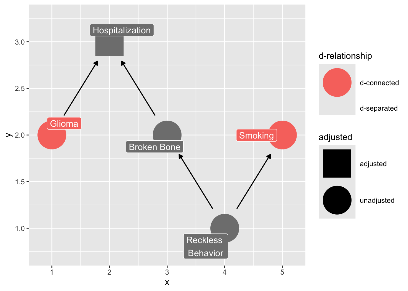 > Let's say we're doing a case-control study and want to assess the effect of smoking on glioma, a type of brain cancer. We have a group of glioma patients at a hospital and want to compare them to a group of controls, so we pick people in the hospital with a broken bone, since that seems to have nothing to do with brain cancer. However, perhaps there is some unknown confounding between smoking and being in the hospital with a broken bone, like being prone to reckless behavior. In the normal population, there is no causal effect of smoking on glioma, but in our case, we're selecting on people who have been hospitalized, which opens up a back-door path: