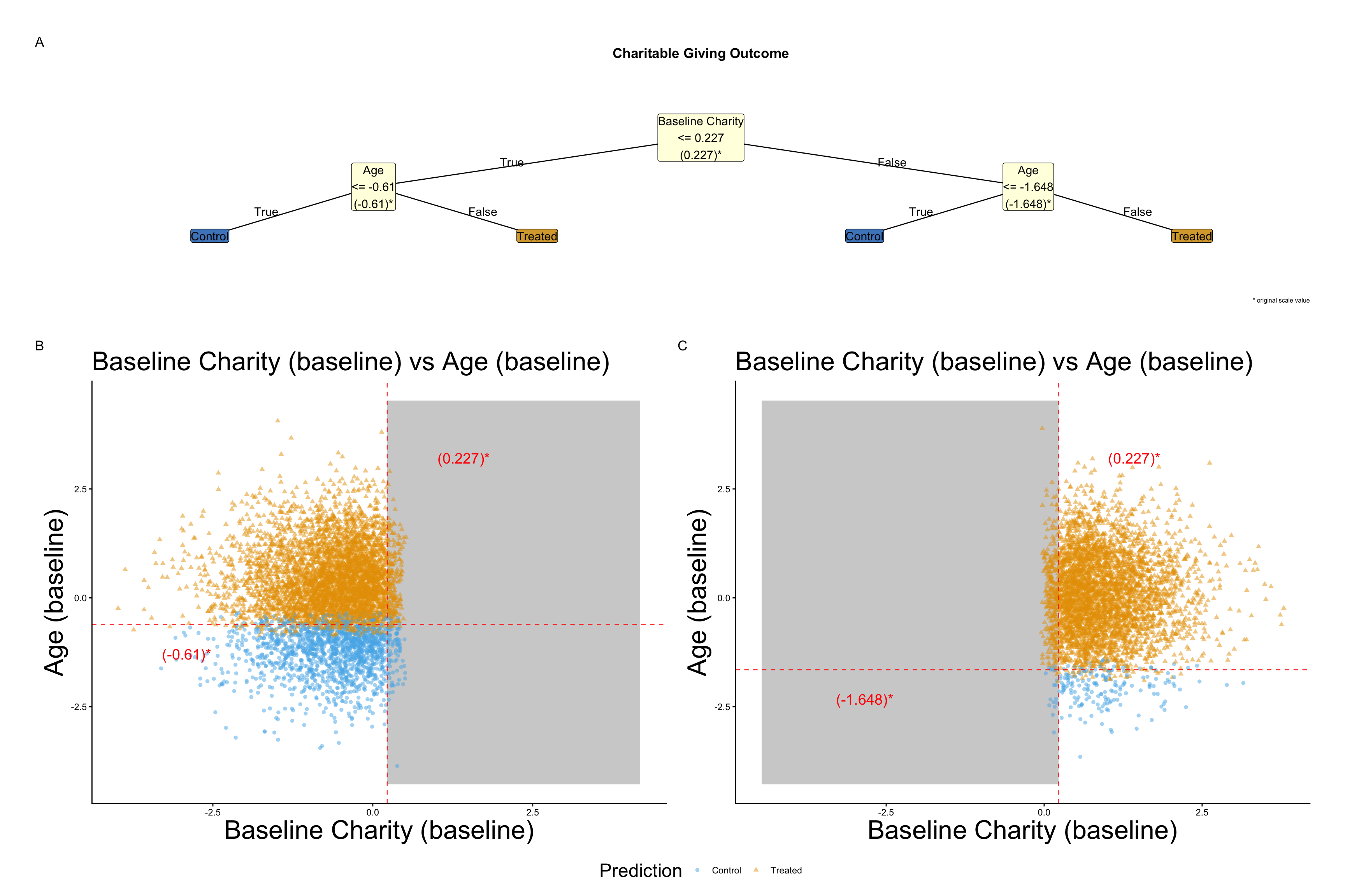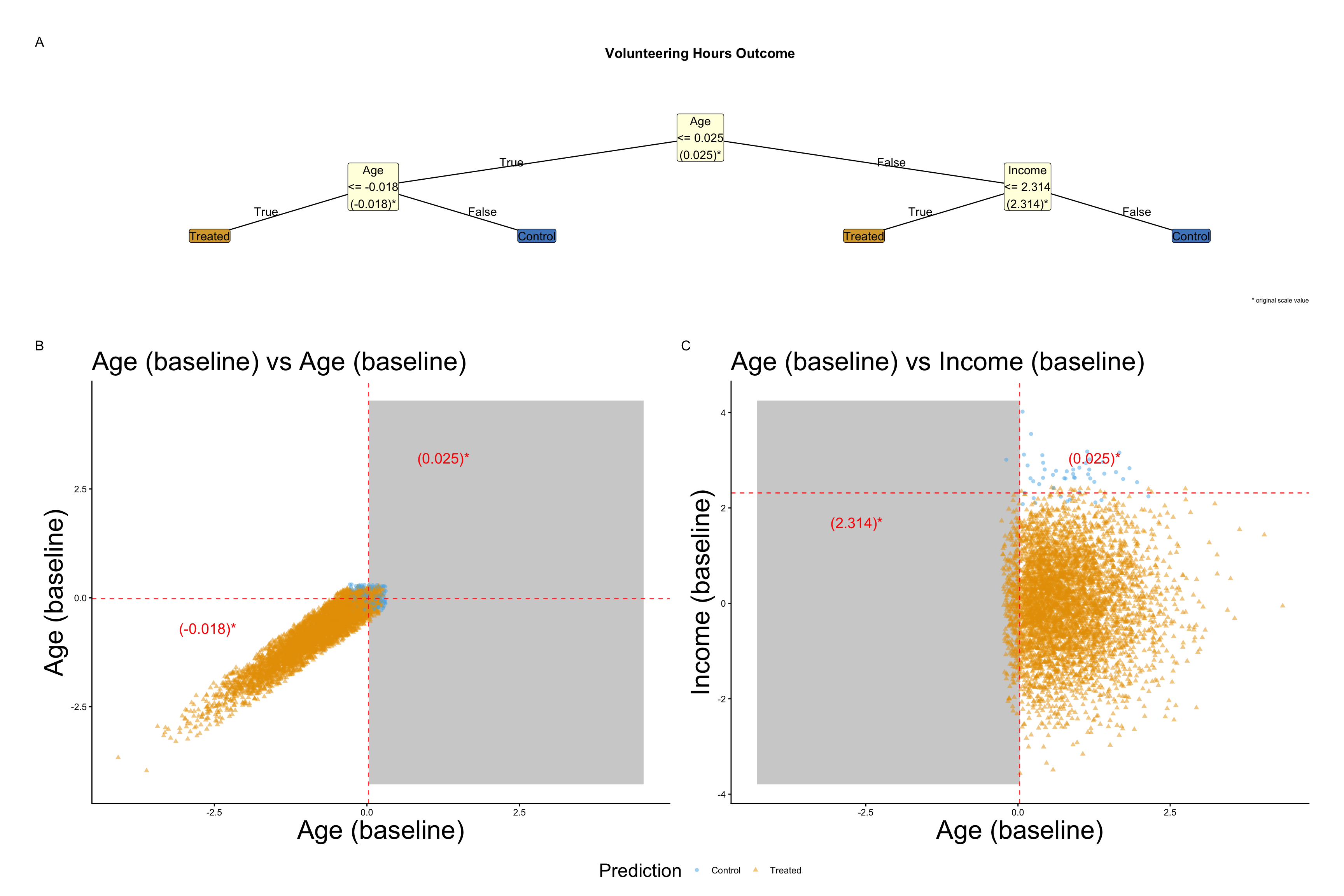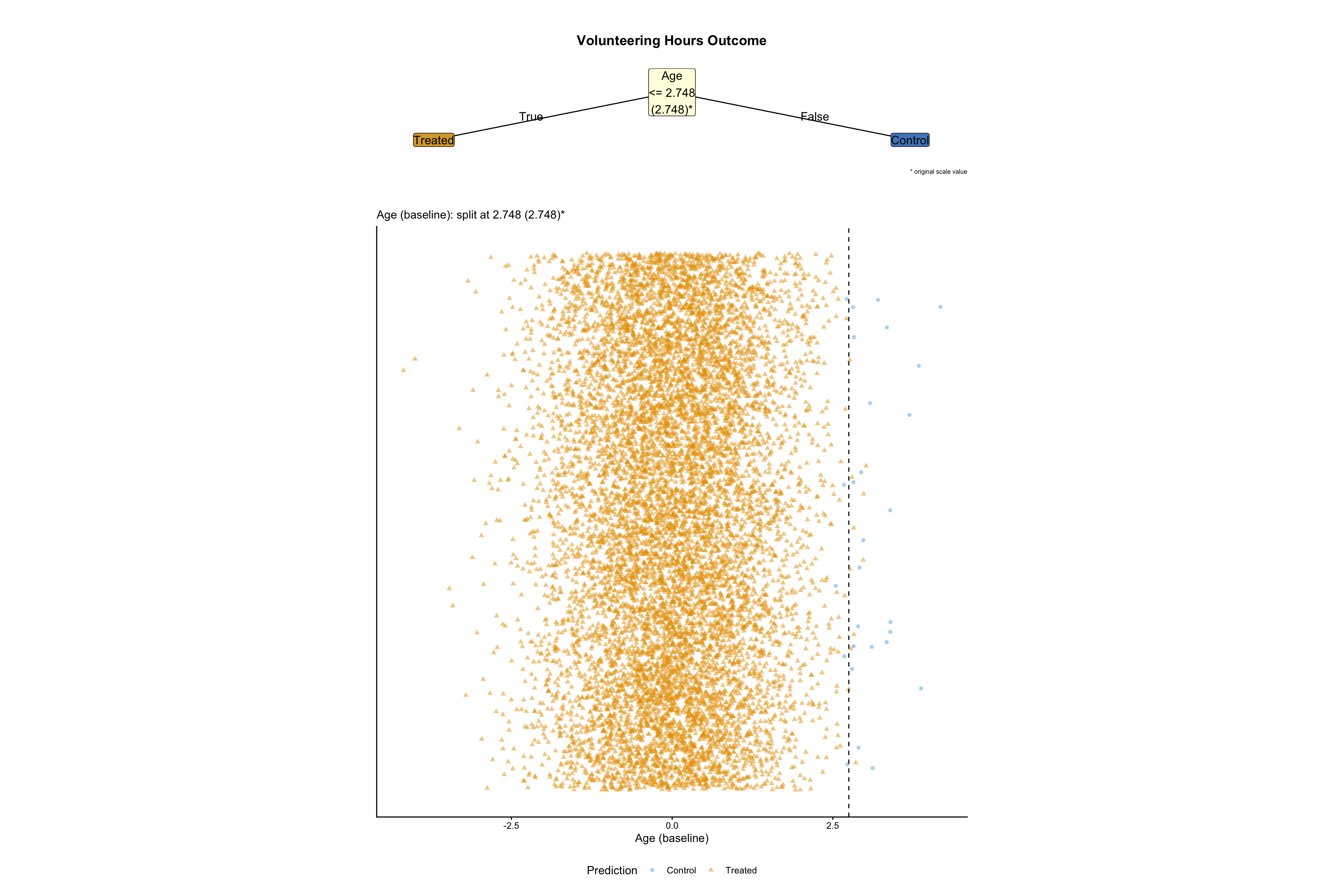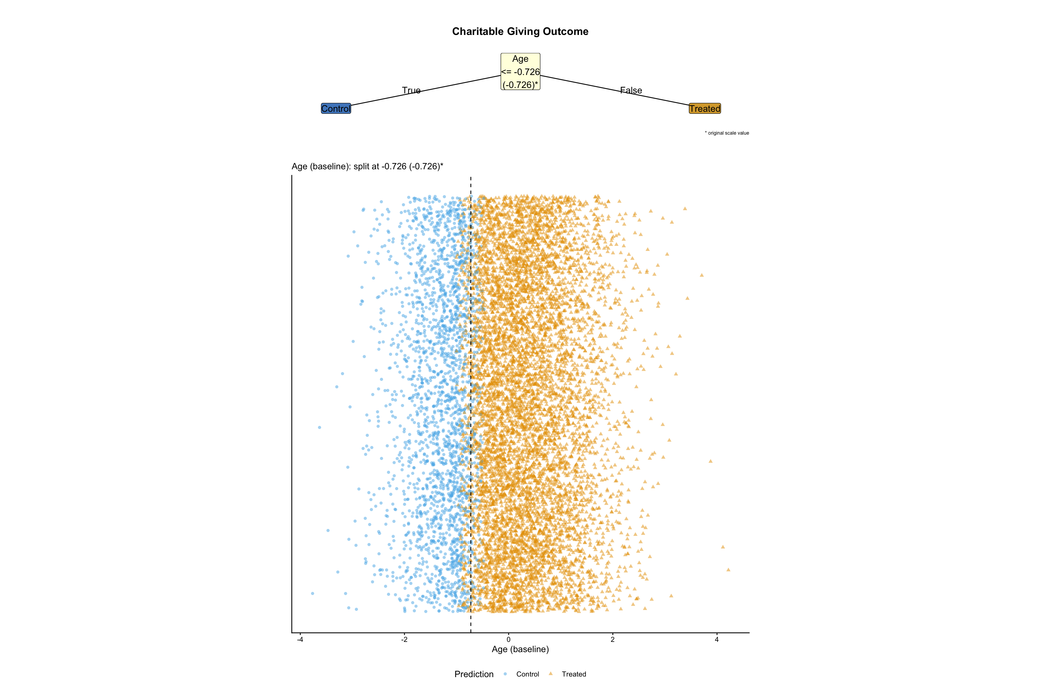 As indicated in @fig-policy-trees-no-variation-none there is no genuine treatment variation. Prediction are at the margins of the population, reflecting noise in the data generating process.